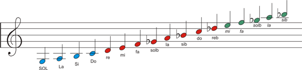 - Sol, La, Si, Do - Re, Mi, Fa, Solb, La, Sib, Do, Reb - Mi, Fa, Solb, La, Sib.